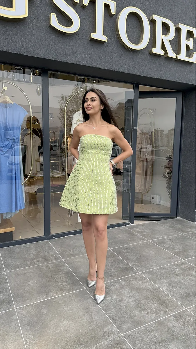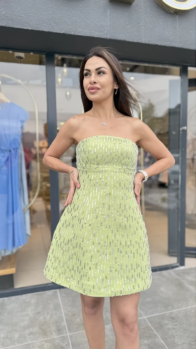 Işıltılı Yeşil Straplez Mini Elbise – Özel Günler İçin Şık Tasarım